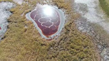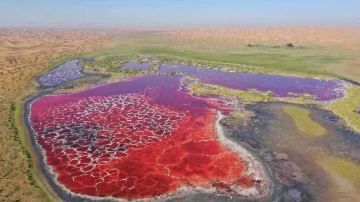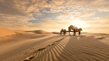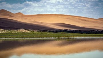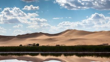 腾格里沙漠沙峰壮阔宏大,沙粒细微软滑,颜色金黄闪亮。行至大漠深处,除了金色的沙海,还有许多湖泊,远远望去,湖边堆堆盐囱恰似冰雪,湖面泛着银光,犹如沙海冰川。