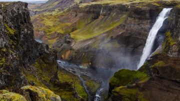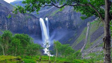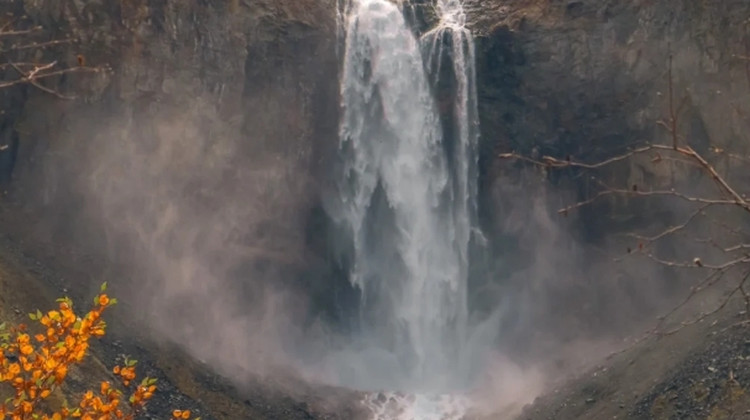 长白山天池北面有一个小缺口,湖水由此溢出,流经千米后一泻而下,形成了落差达68米的的长白瀑布,然后汇入二道白河,即松花江正源。站在瀑布前的观景台远观瀑布,只见水流似从天而降,落地声如雷贯耳。长白山瀑布位于天池北坡,乘槎河的尽头。由于山大坡陡,水势湍急,一眼望去,瀑布像一架斜立的天梯。瀑布口有一巨石叫“牛郎渡”,将瀑布分为两股。两条玉龙似的水柱勇猛的扑向突起的石滩,冲向深深的谷地,溅起几丈高的飞浪,犹如天女散花,水气弥漫如雾。