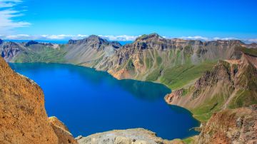 长白山天池是火山喷发后在雨水、雪水和地下泉水的作用下形成的火山口湖,它也是松花江的源头。游客登上山顶可见群峰叠嶂、气势恢宏,十六座山峰簇拥着一潭平静的湖水,在蓝天晴空的映照下,湖水深邃幽蓝,格外迷人。