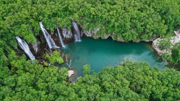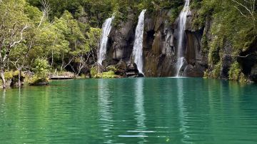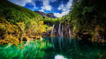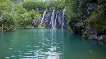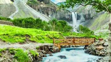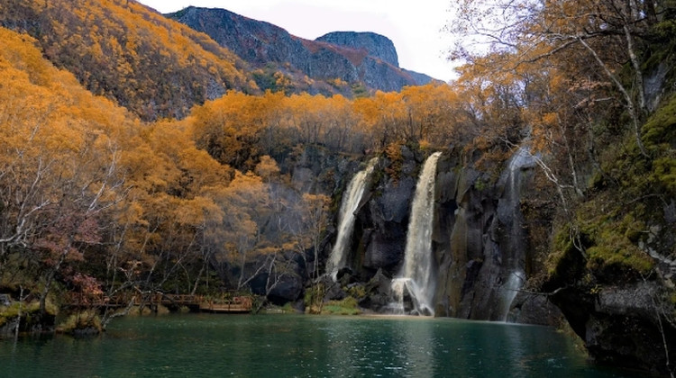 绿渊潭是北坡景区内的一汪水潭,因其潭水极为碧绿清澈,颇似九寨之水,故有“东北小九寨”的美誉。绿渊潭一侧有瀑布顺山崖而下,为潭水增添色彩,景致优雅。绿渊潭瀑布高落差达26米,瀑水落于巨石而四溅,而后流入深潭。每逢雾起,潭上水雾弥漫,美不胜收。游客可在潭边远观瀑布和碧潭全景,也可下到瀑布边近观。游览完毕沿栈道返回,途中可见玉浆泉,还有“千年等一回”、“真的还想再活500年”等形态有趣的枯树。地址:延边朝鲜族自治州安图县二道白河镇长白山火山国家地质公园内